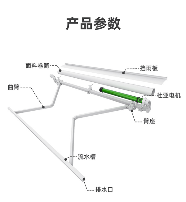 曲臂遮阳篷,使用机械装置和曲臂装置系统,在弹簧的作用下,产生伸缩张力,使篷面展开和收缩,整个曲臂组能实现8-70度任意精确平行调整。可通过不同传动系统:手动摇杆、电机遥控。结构骨架采用高强铝合金制成。根据安装位置可选择立面安装式和吊装式。曲臂遮阳篷分豪华全盒型、半盒型、开放性;:篷布分为涤纶布面料、亚克力面料(可保证5年不退色);