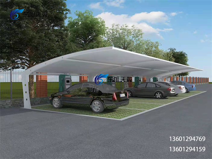 3.颜色。膜结构车棚室内的人对白色或灰白色的膜材料有很好的颜色感知,因为这两种颜色对可见光表现出线性光谱透射的特性。透射度随着透射光波长的增加而增加,使得透射光比入射光略暖。透射光谱和纤维及其特性、涂层厚度等。膜结构停车棚装配工作须严格遵循工艺标准。如果没有安装主连接器,须用牢固的压绳固定,以避免建筑物晃动。
